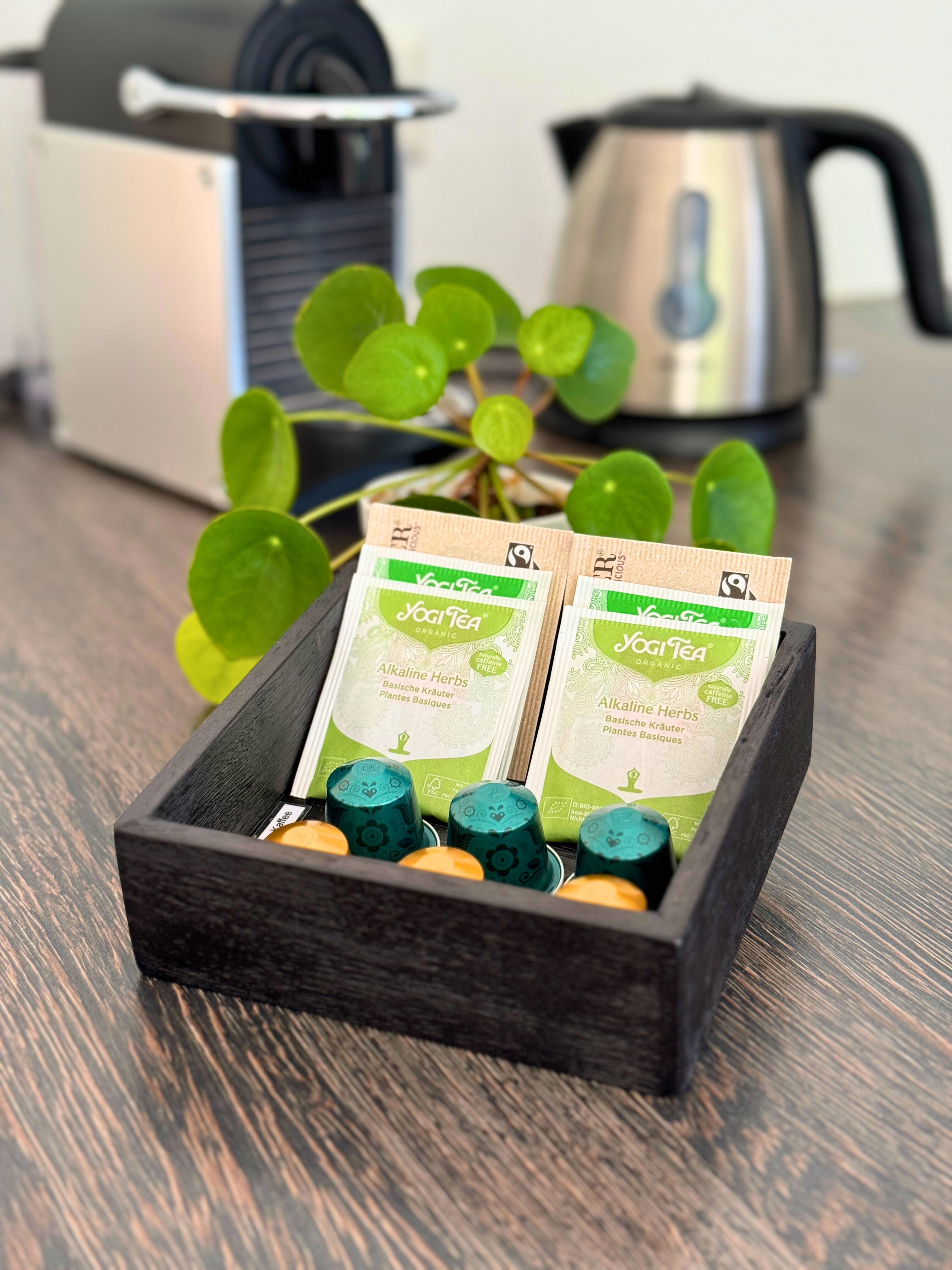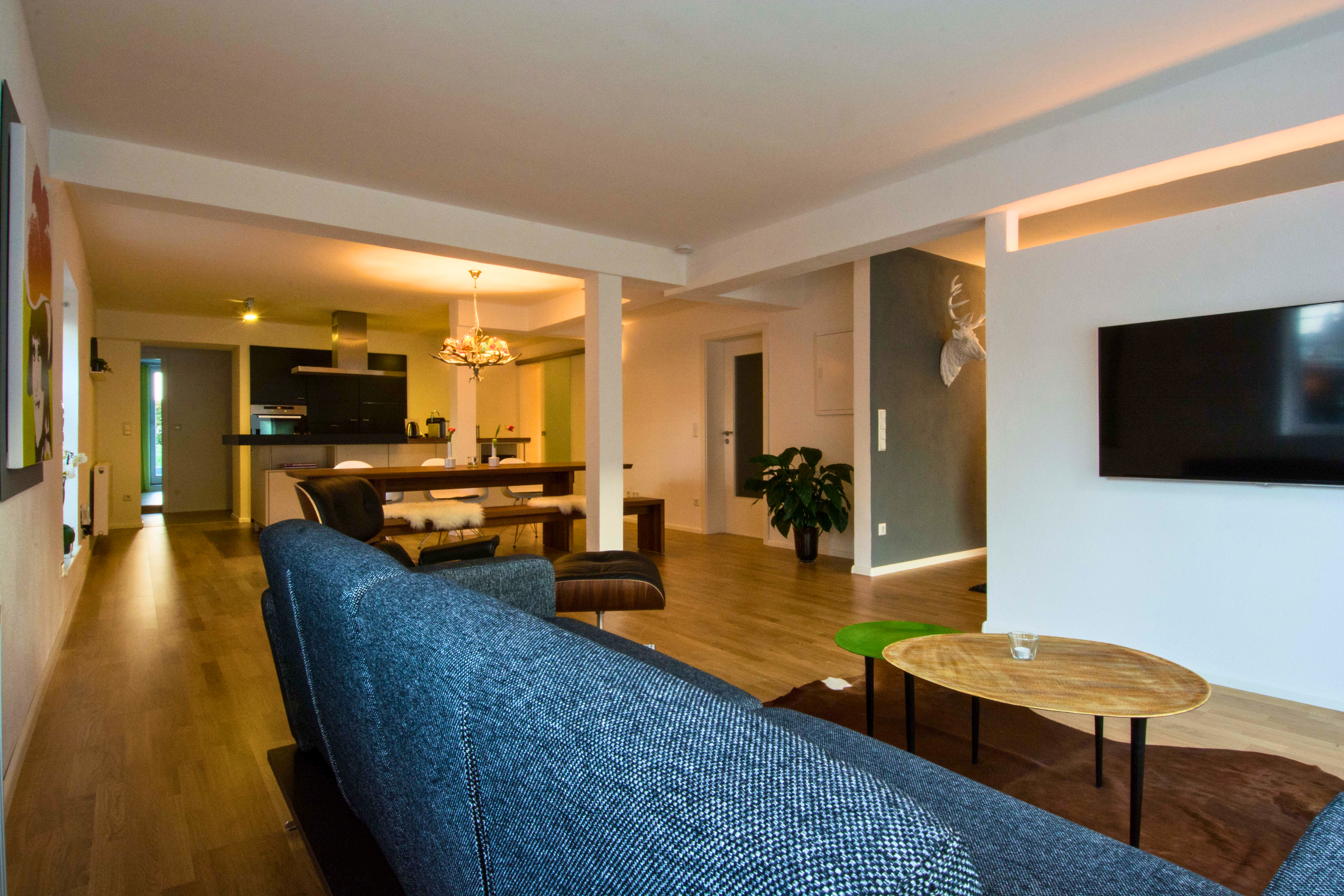 Die großzügige Aufteilung des Wohnbereichs, etwa 70qm, umfasst einen Eingangsbereich mit Chill-Ecke und Eiersessel, das Wohn- und Esszimmer sowie die Küche. Der freistehende Block und die hochwertige Ausstattung lassen in der Küche keine Wünsche offen und intergrieren sie wie ein Möbelstück in den Wohnraum.